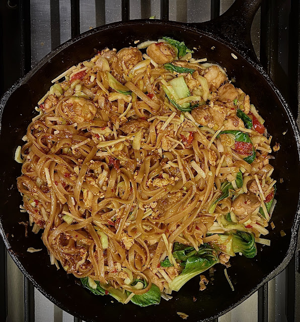 spicy pork stir fry with bock choy and rice noodles |
